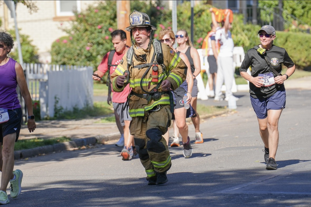 Project Engineer 2 Nick Tartaglia running in his firefighter gear.