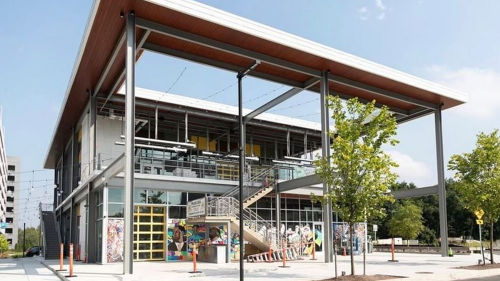 Merriweather E2 is a new cultural hub that is part of the 35-acre mixed use development planned for the Merriweather District located in Downtown Columbia. This freestanding building features a Busboys and Poets restaurant, the restaurant’s largest location in the DMV area, with over 400 seats, a second-floor terrace with outdoor seating, a bookstore, and a room for private events.
